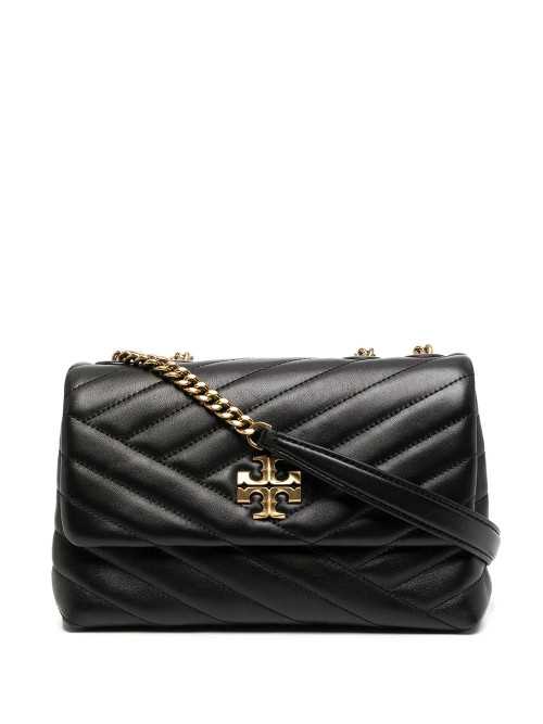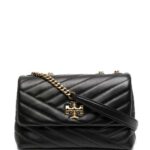 Tory Burch Black Kira Chevron Small Convertible Shoulder Bag. The Kira small shoulder bag is crafted from nappa leather with a cotton herringbone lining and a gold-tone hardware. It features a flap with magnetic snap closure, 2 interior slit pockets, 1 interior zipper pocket, convertible chain shoulder strap with 22.2″ drop, and a beveled Double T hardware. Leather 100%.