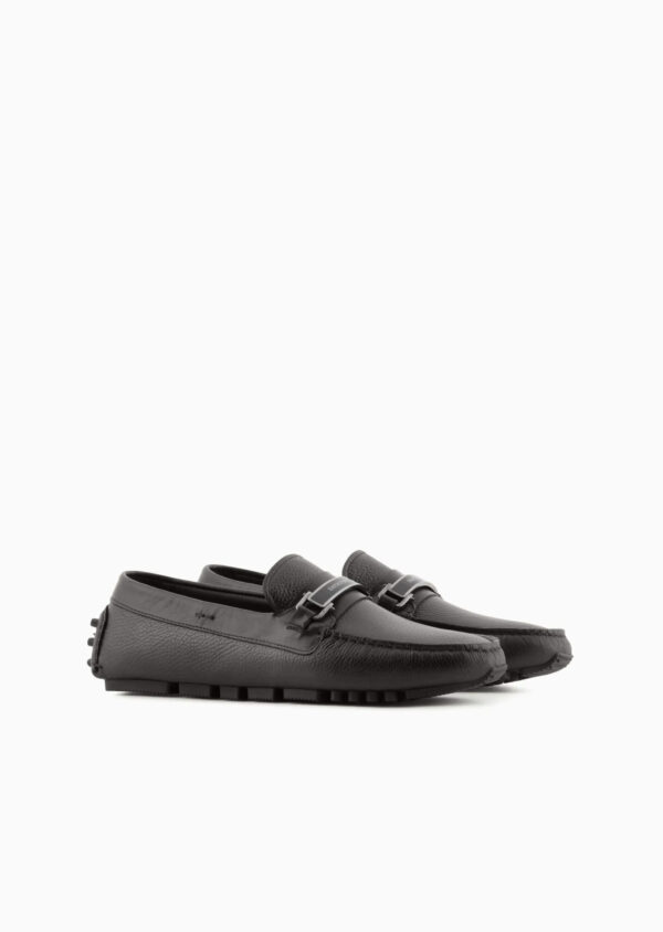 Loafers with a grained leather upper and a metal buckle stitched with the logo lettering. This iconic footwear style is crafted from exclusive leather, emphasizing Emporio Armani’s relentless and innovative approach to research and development. With its successful combination of function and style, it can be worn in any season, making it a must-have in any modern man’s wardrobe.