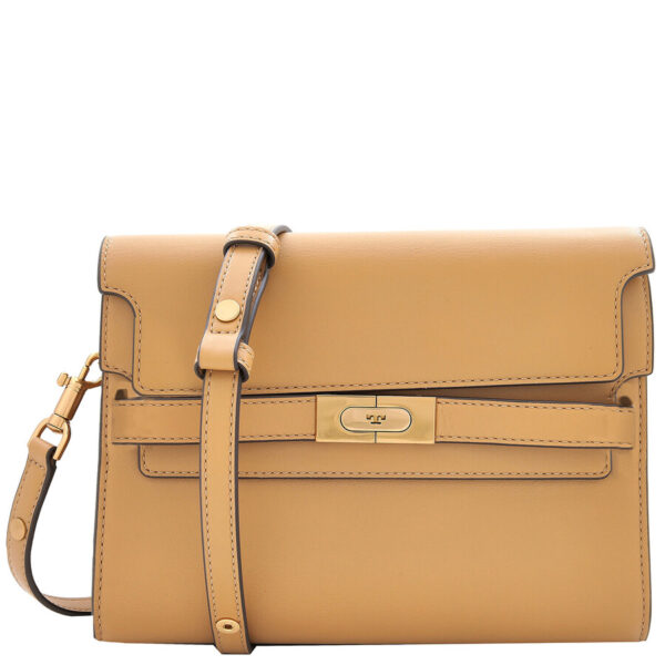 Tory Burch Shoulder Bag. SKU: 158720-200. Color: Macadamia. Size: Height: 6.9″ (17.5cm) x length: 9.5″ (24cm) x dept. Tory Burch Ladies Lee Radziwill Shoulder Bag – Macadamia. Crafted from aalf leather, this Radziwill bag features exterior front slide pocket under bottom flap, 2 interior main compartments, 1 interior center zipper pocket, microfiber lining with a suede-like finish, flap and belted strap with clasp buckle closure, napa leather trim and finished with gold-toned hardware. Material: Calf leather; Nappa leather.